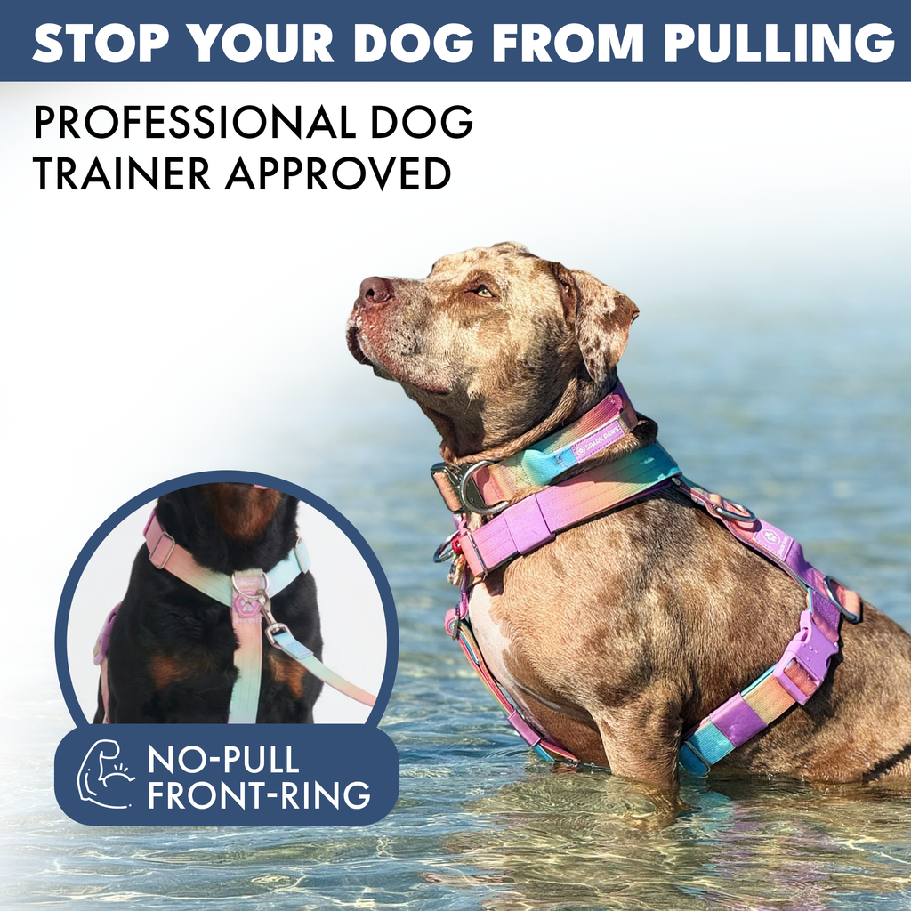 A: Our no-pull dog harness is designed to discourage your dog from pulling on the leash during walks. The front D ring works by redirecting your dog's pulling force to the sides or front of the harness, rather than allowing them to pull forward. You can also use the Back D ring for everyday walking or the Rear D ring for restraing free running.