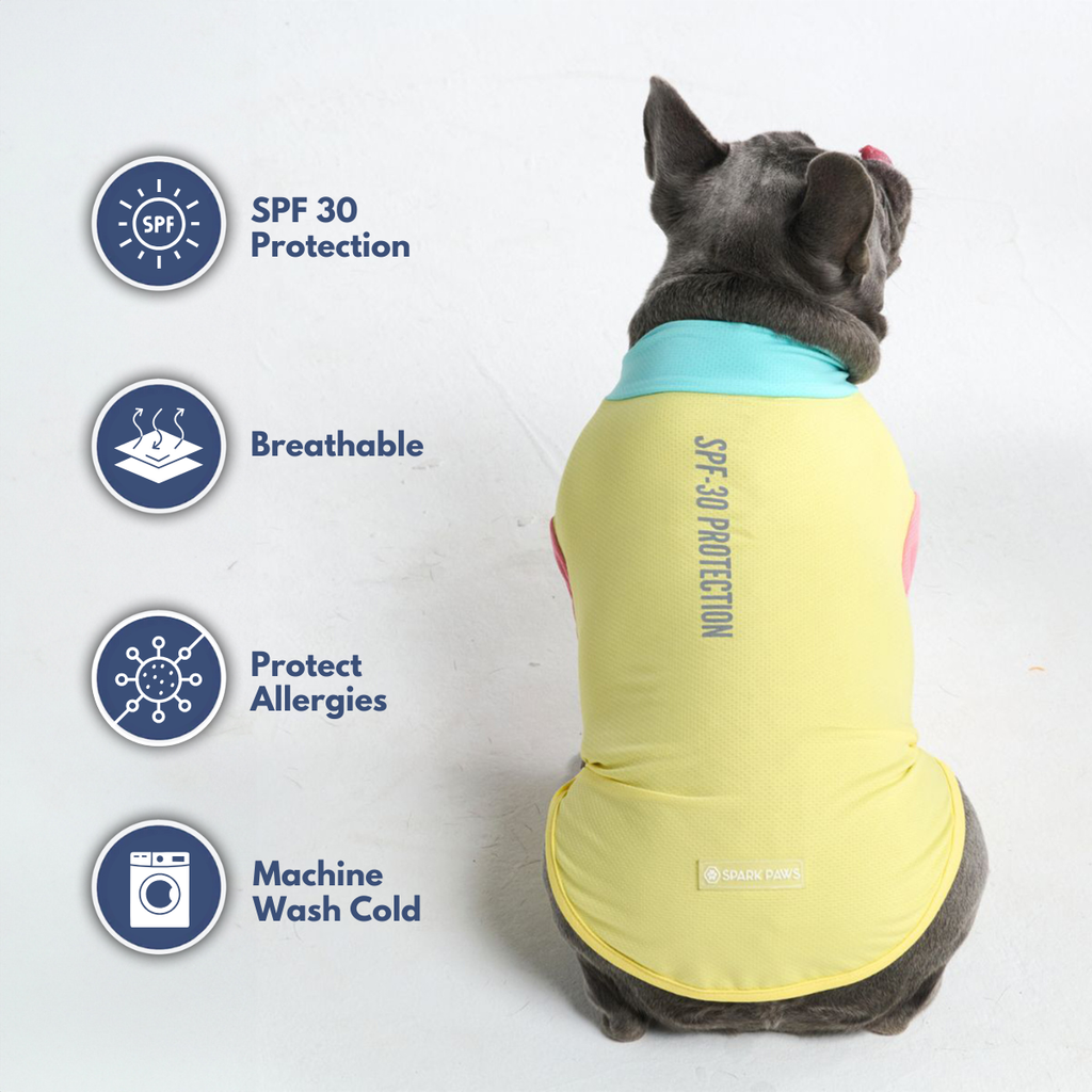 Protect your dog from the sun with our SPF 30/UPF 30 Sun-Block Dog T-Shirt, blocking 96%+ of harmful UVB rays while keeping your dog clean and allergen-free.
